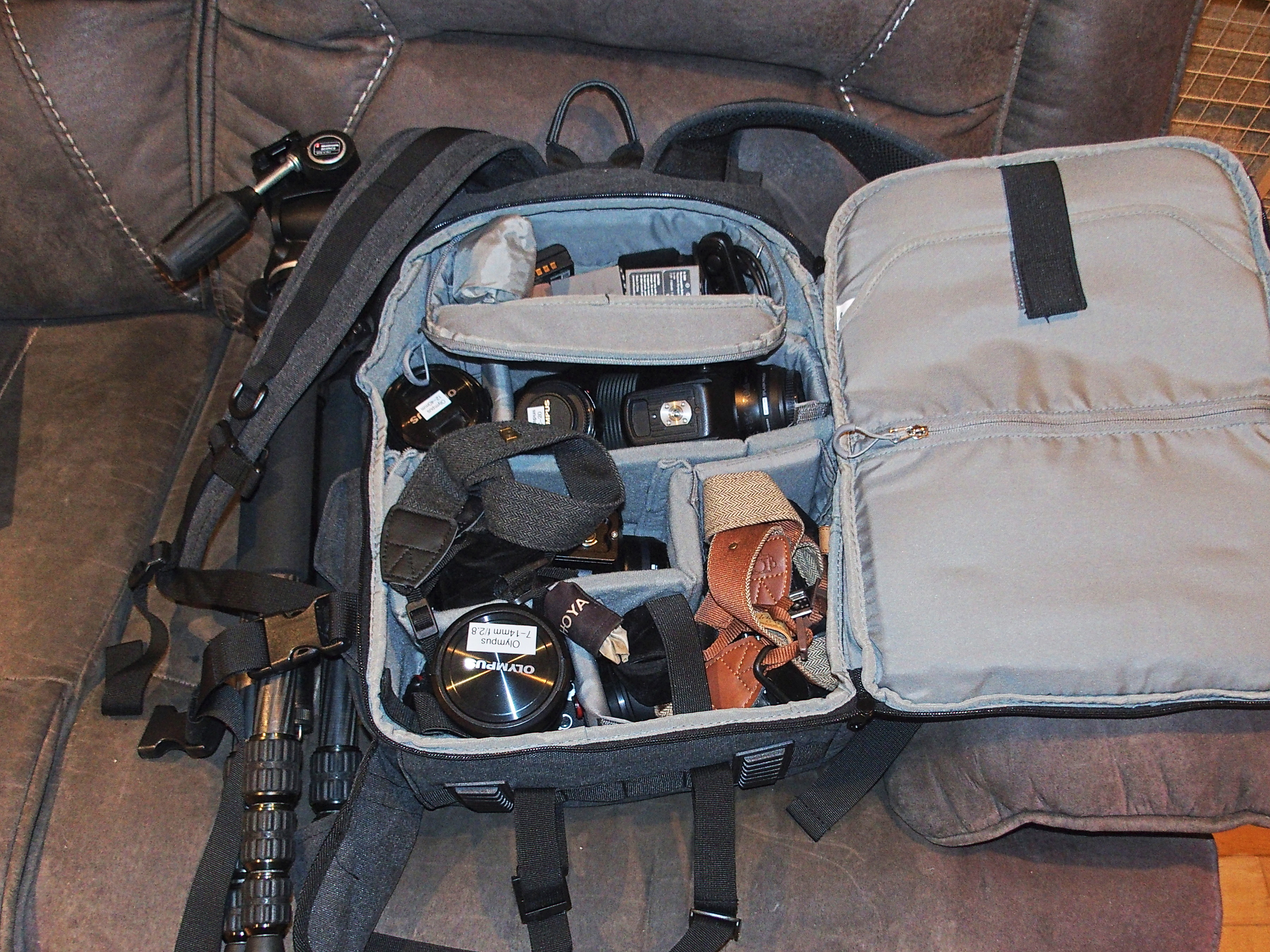 Picture #16: Tullio backpack loaded Small: 900x698, 155,060 bytes (152K), (html file) Large: 3600x2700, 3,158,630 bytes (3.0M), (html file) Copyright, Michael Meissner 2024, All rights reserved Olympus Stylus-1 camera f/2.8, ISO 400, flash, 1/30 sec, 6.0mm, auto mode, vivid color, SHQ, matrix metering, IS Auto, noise reduction auto 35mm equivalent focal length 28.0mm Programs used: crop, raw therapee Taken by Michael Meissner on October 13, 2024 01:18:31 Last modified on October 13, 2024 at 01:50 Tulio backpack includes: