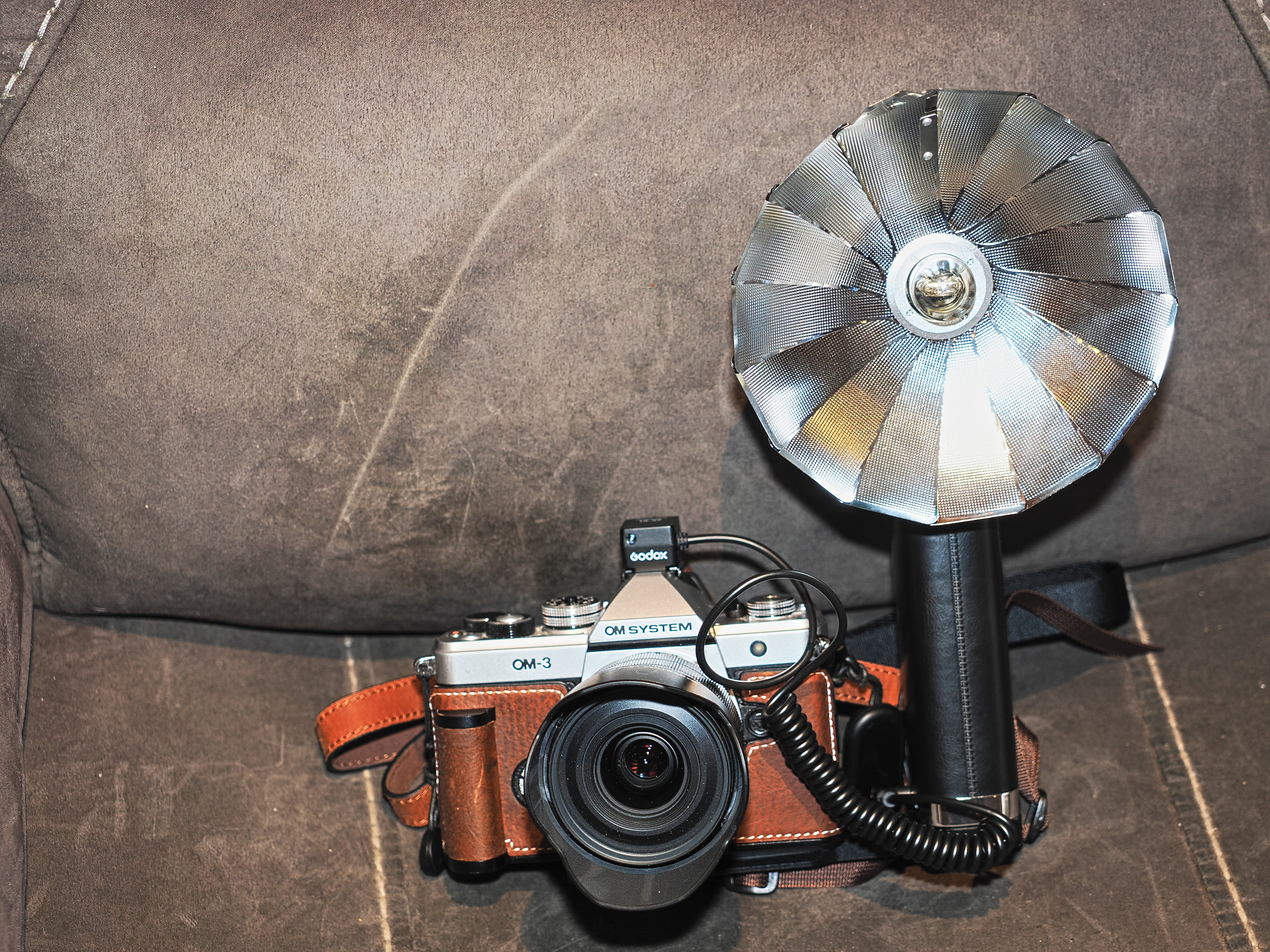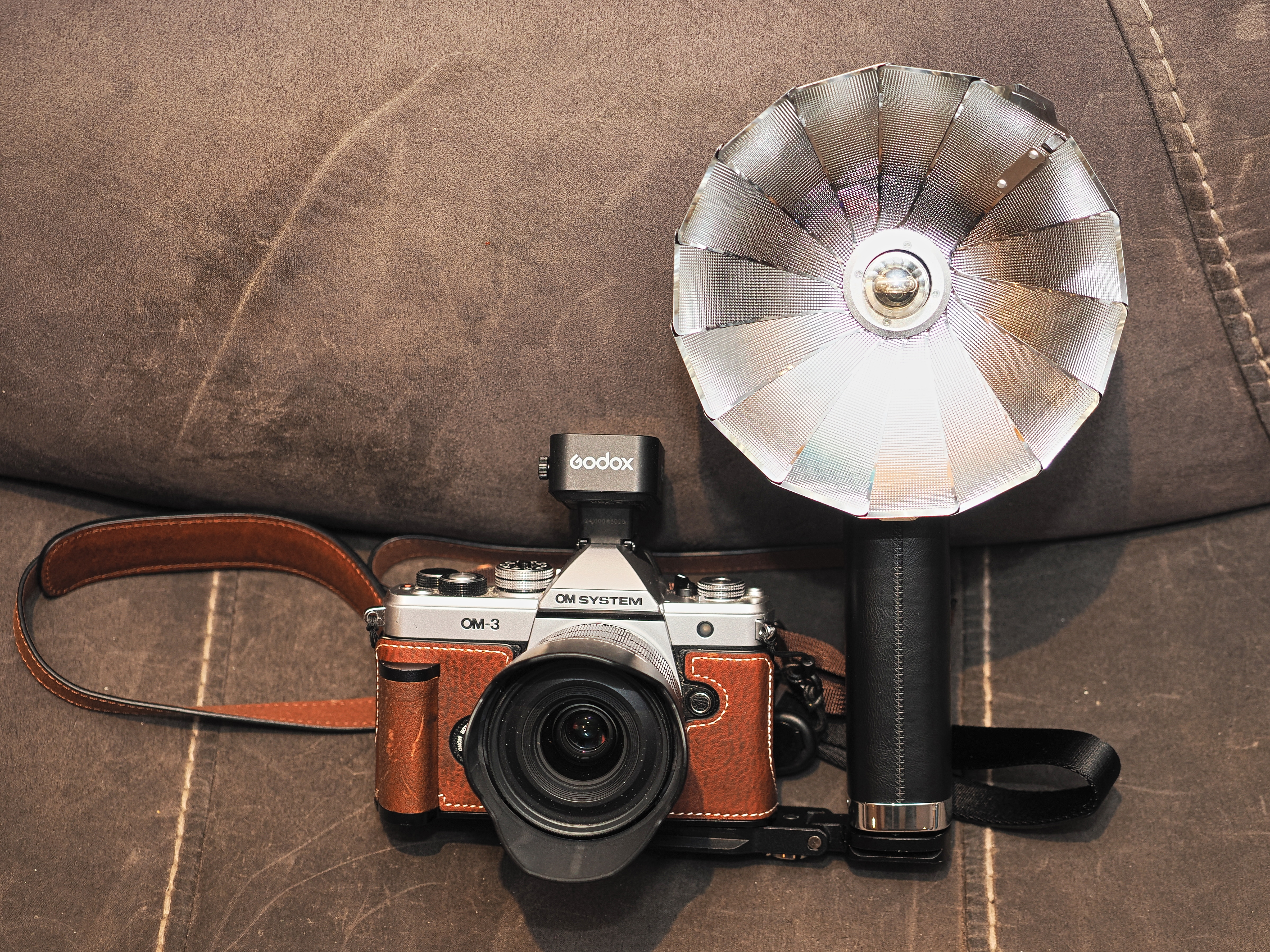 Picture #8: OM-3 with Godox Lux Retro Master flash and auto flash control Small: 960x743, 213,618 bytes (209K), (html file) Large: 4800x3600, 6,371,563 bytes (6.1M), (html file) Copyright, Michael Meissner 2025, All rights reserved OM OM1 camera with Olympus-m43 12-40mm f/2.8 lens f/2.8, ISO 200, FL-50R flash, 1/60 sec, 38.0mm, auto mode, vivid color, matrix metering, IS Auto, anti-shock 35mm equivalent focal length 76.0mm Programs used: crop, raw therapee Taken by Michael Meissner on August 27, 2025 01:21:44 Last modified on August 27, 2025 at 02:12 I am using the optional auto flash control instead of the Godox X3 trigger. This shot shows the standard Fan Type Reflector (LM-R27). |