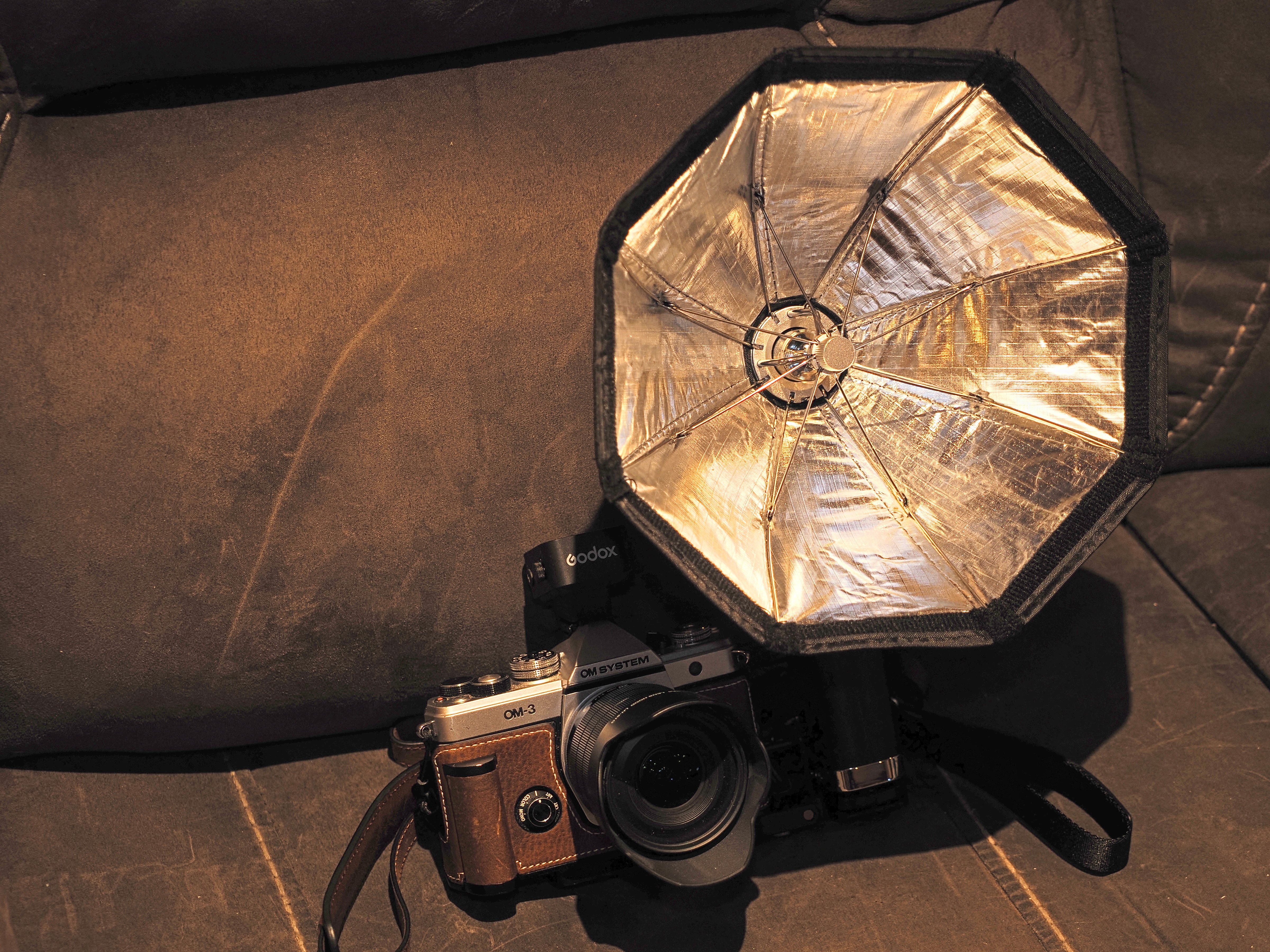 Picture #9: OM-3 with Godox Lux Retro Master flash and LM-S25 #2 Small: 960x743, 105,978 bytes (104K), (html file) Large: 4800x3600, 3,385,676 bytes (3.2M), (html file) Copyright, Michael Meissner 2025, All rights reserved OM OM1 camera with Olympus-m43 12-40mm f/2.8 lens f/2.8, ISO 200, FL-50R flash, 1/60 sec, 32.0mm, auto mode, vivid color, matrix metering, IS Auto, anti-shock 35mm equivalent focal length 64.0mm Programs used: crop, raw therapee Taken by Michael Meissner on August 27, 2025 01:17:29 Last modified on August 27, 2025 at 02:10 I am using the Godox X3 to trigger the flash via radio. This shot shows the Octa Softbox (LM-S25) and the diffuser for the Octa Softbox. |